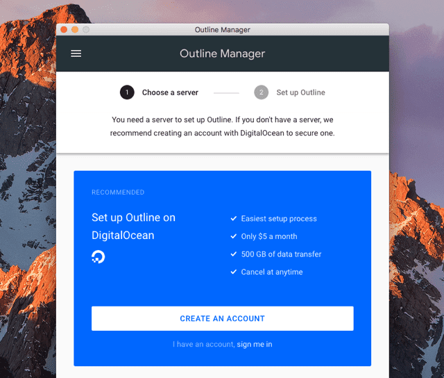 Outline Manager চালু করার পর আপনারDigital Ocean একাউন্টে লগইন করার জন্য "Sign me in" এ ক্লিক করুন।