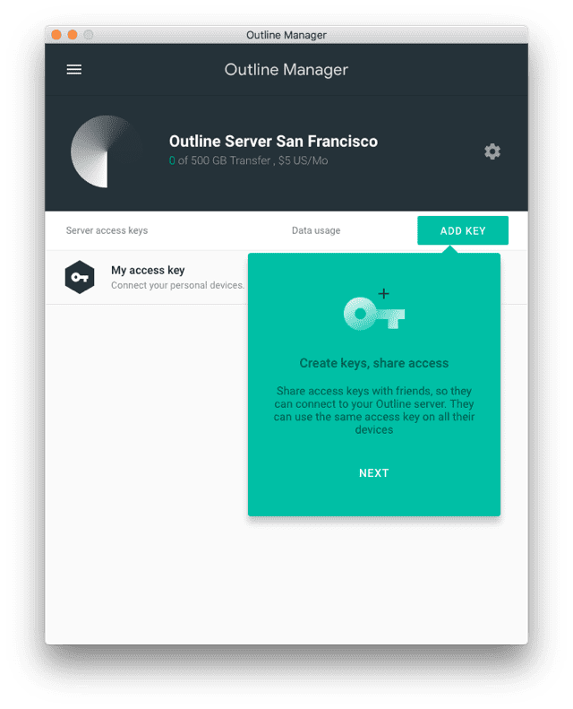 VPN সার্ভিস তৈরি হয়ে গেলে আপনি একটি এক্সেস কোড পাবেন। আপনি যদি এই VPN অন্য কোথাও অথবা বন্ধুদের সাথে ব্যবহার করতে চান তাহলে "Add Key" ক্লিক করুন তাহলে নতুন একটি কোড পাবেন এবং এখানে মনে রাখতে হবে বাকিদেরও Outline Client App ইন্সটল করা থাকতে হবে।