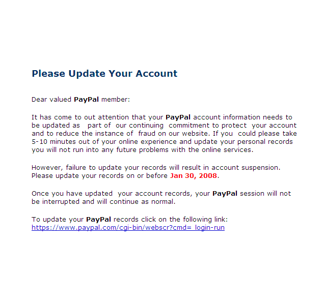 নিচের ছবিটির দিকে খেলায় করুন। এমন ভাবে একটি মেইল আসছে মনে হচ্ছে এটা অফিসিয়াল পেপাল থেকে আসা। শুধু তাই নয় একজন যখন এই লিংকে ক্লিক করবে তখন এটি এমন একটি পেজে নিয়ে যাবে যা অফিসিয়াল ওয়েবসাইটের মতই। যখন কেউ তথ্য দেবে সাথে সাথে হ্যাকড! এগুলোই সাধারণত সাধারণ ফিশিং।