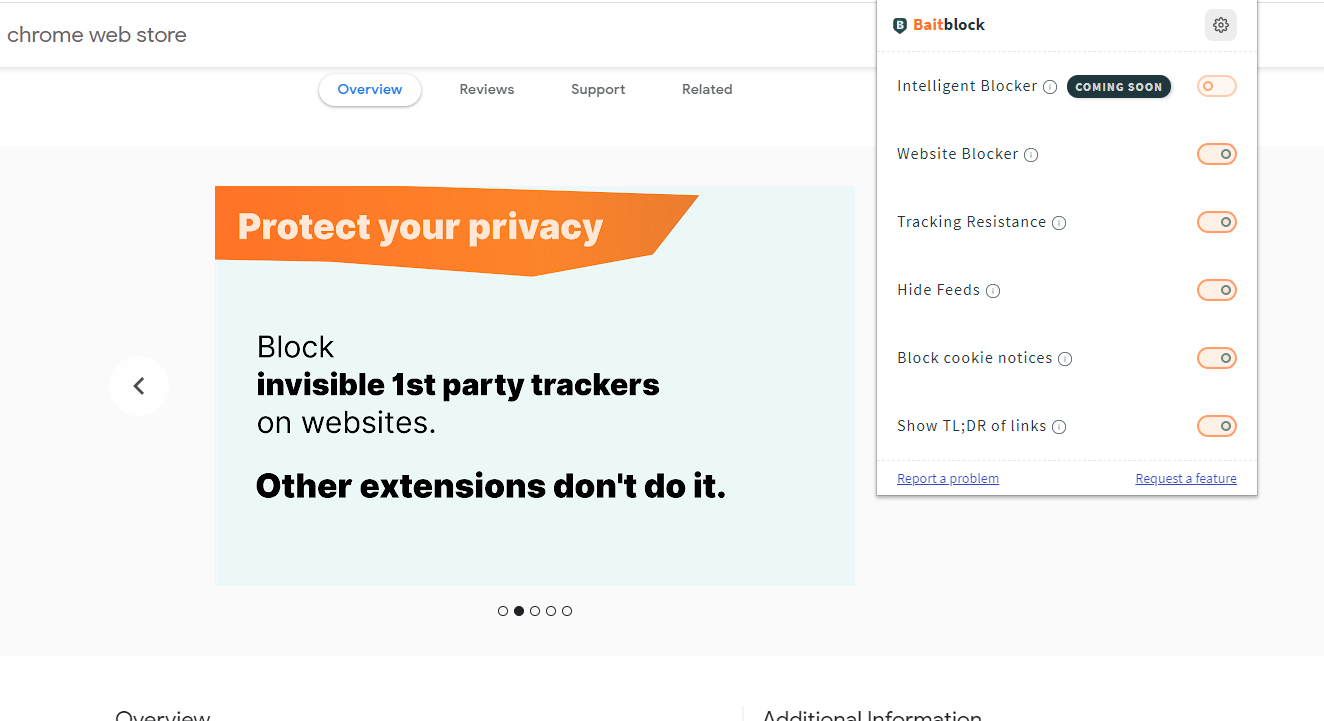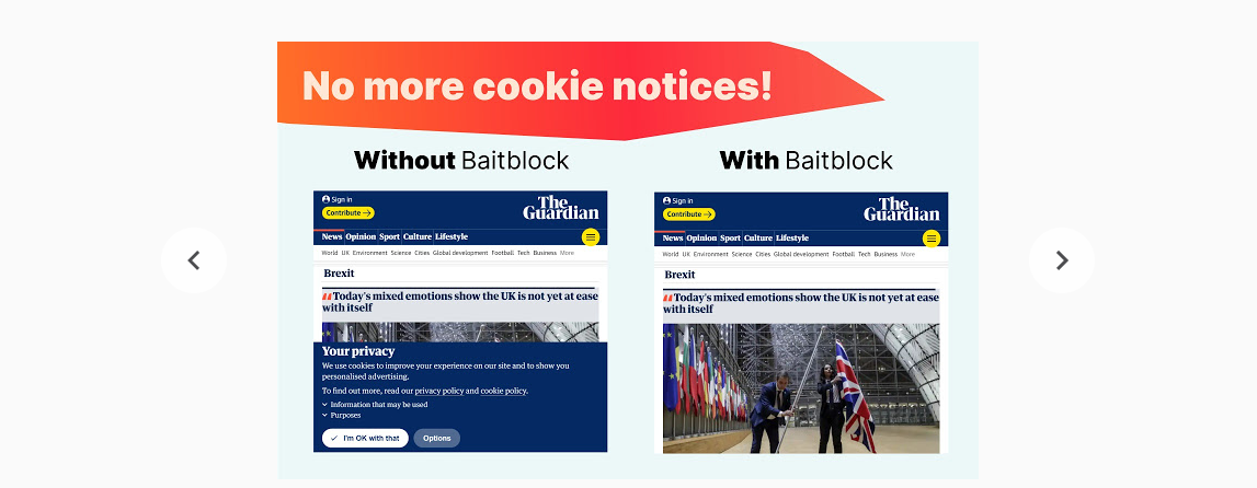 Bait Block একটি ফ্রি ব্রাউজার এক্সটেনশন যা ব্যবহার করে আপনি নিরাপদে৷ নিশ্চিন্তে ব্যবহার করতে পারবেন ইন্টারনেট। এটি আপনার জন্য দারুক দারুণ সব ফিচার প্যাক করে রেখেছে যেমন, Block Website, Third Party Cookies ইত্যাদি। এটির ওয়েবসাইট ব্লকিং ফিচারটি দারুণ স্মার্ট এটি শুধু আপনার পছন্দের সাইটের URL ই শুধু ব্লক করবে না সাথে সাথে সার্চ ইঞ্জিন বা অন্য কোথাও ম্যানশন করাও ব্লক করে দেবে। এটি বর্তমানে Google Chrome এবং অনন্য Chromium ব্রাউজারে সাপোর্ট করে।