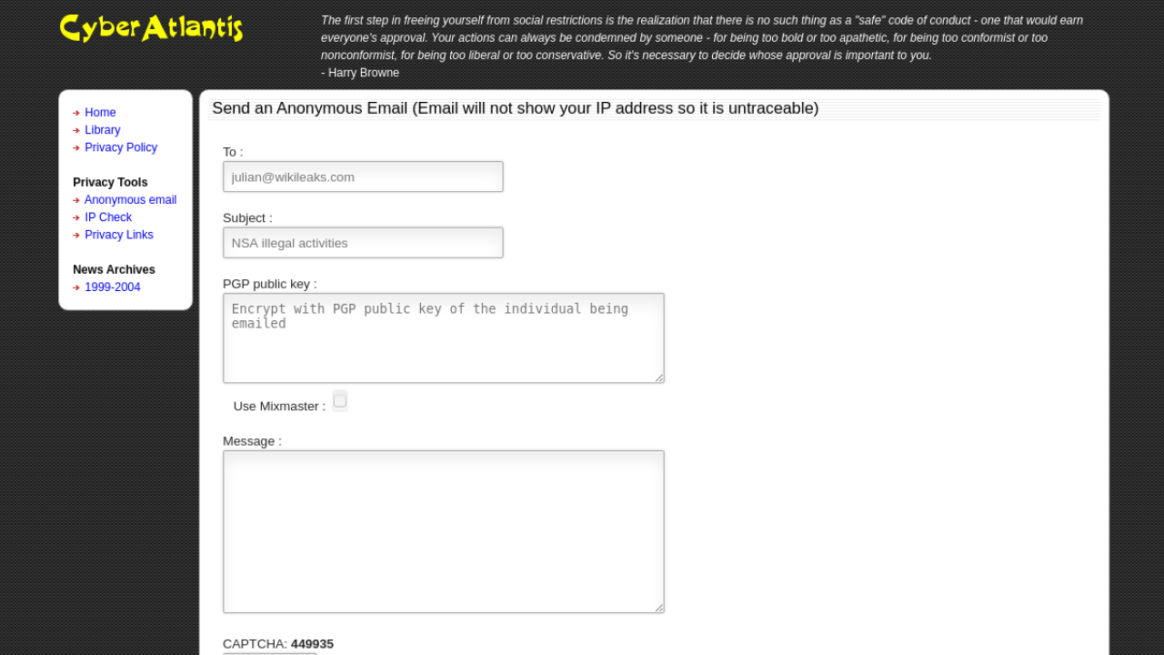 আপনার আইপি এড্রেস হাইড করে ইমেইল পাঠানোর আরেকটি ফ্রি সার্ভিস হচ্ছে Cyber Atlantis। এটি একই সাথে PGP encryption সার্ভিস প্রোভাইট করে। এর মাধ্যমে ইমেইল সেন্ড হবার আগে আইপি হাইড হবার পাশাপাশি আপনার কন্টেন্টও এনক্রিপ্ট হয়ে যায়।