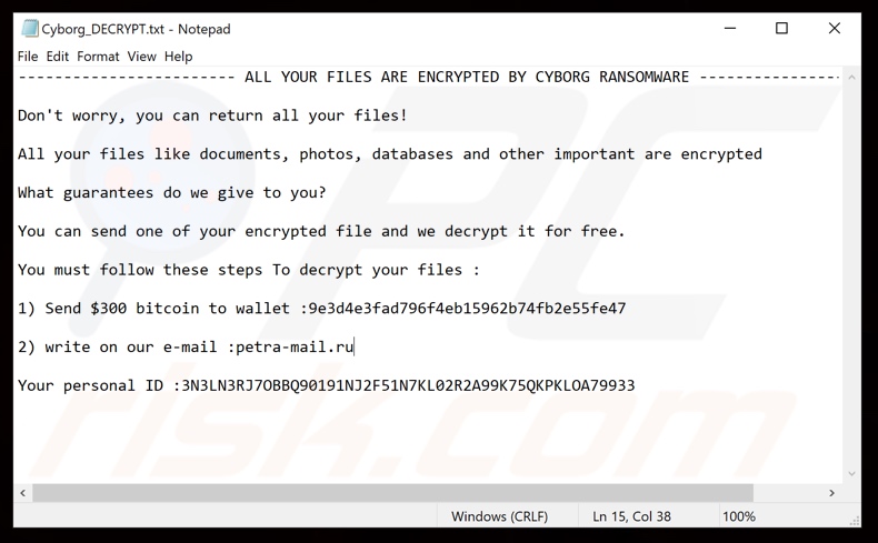 Cyborg ভাইরাসটি অনেক দীর্ঘ সময় ধরে বিদ্যমান ছিল এবং ফ্লপি ডিস্কের সময় থেকেই এই ভাইরাসের সূত্রপাত। অতি সম্প্রতি, এই ভাইরাসটি নকল উইন্ডোজ ১০ আপডেট এর মাধ্যমে ব্যাপকভাবে ছড়িয়ে পড়েছে। আর এই পদ্ধতিতে পার্সোনাল কম্পিউটারে ভাইরাসটি আক্রমণ করে থাকে। অতঃপর, এই ভাইরাসটি যখন আপনার সিস্টেমে ইন্সটল হয়ে যায় তখন তা সিস্টেমকে লক করে দেয় এবং ইউজার থেকে অর্থ প্রদানের দাবি করে।