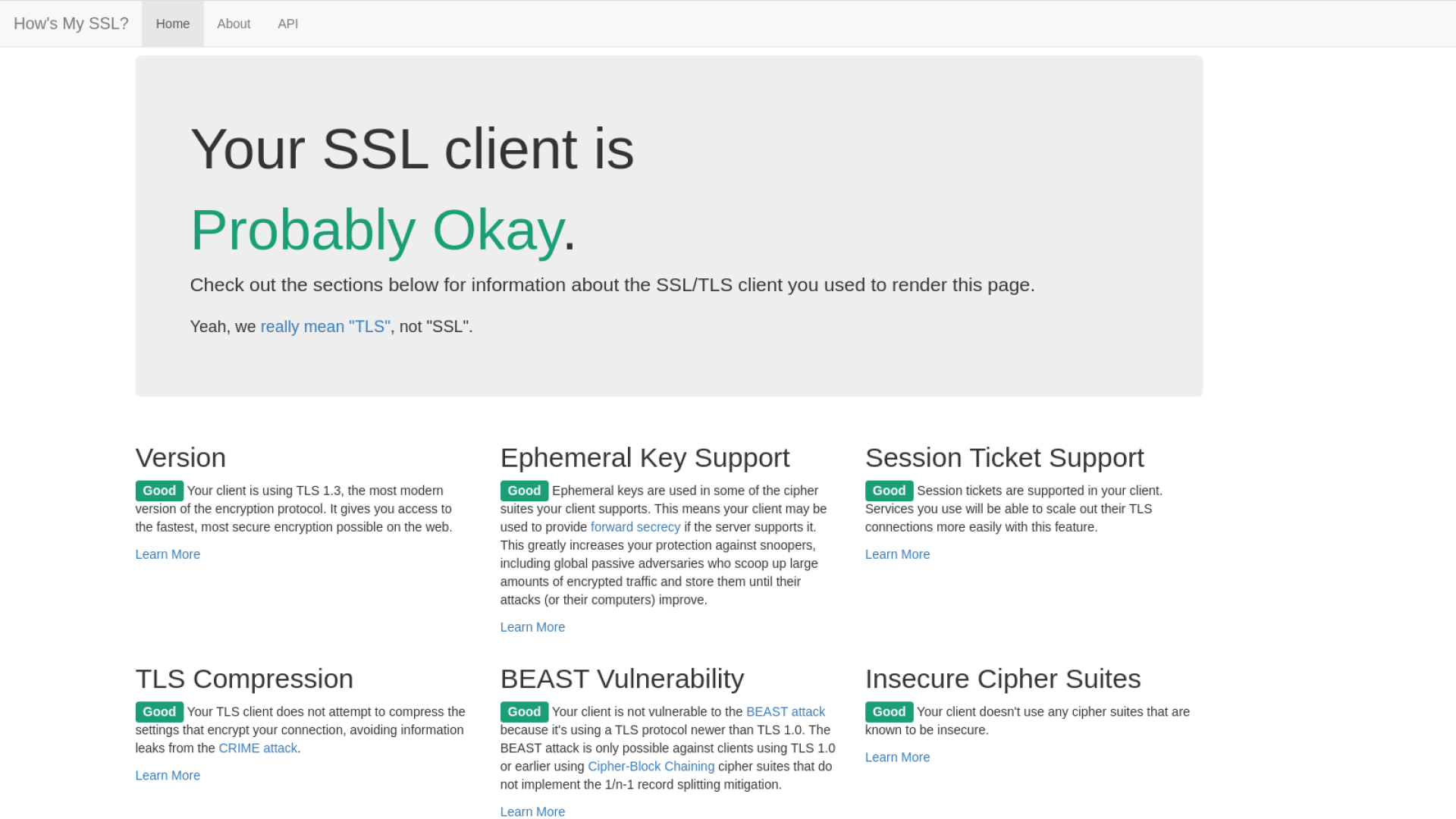 আর আপনার ব্রাউজারটি আসলেই SSL সমর্থন করে কিনা, তা পরীক্ষা করতে How’s My SSL নামক ওয়েবসাইট টিতে ভিজিট করুন। পরীক্ষার রিপোর্ট TLS ফিচারগুলোর সাথে ব্রাউজারের SSL ভার্সনের মিল গুলো উপস্থাপন করে। SSL এর তুলনায় TLS একটু উন্নত ভার্সন। উভয়ের কাজ প্রায় একই। TLS এর পূর্ণরূপ হলো Transport Layer Security।