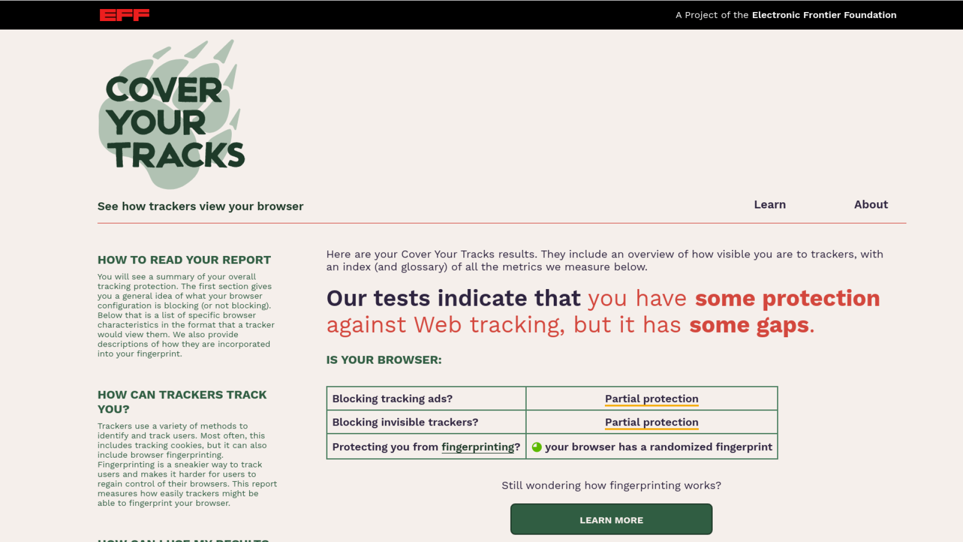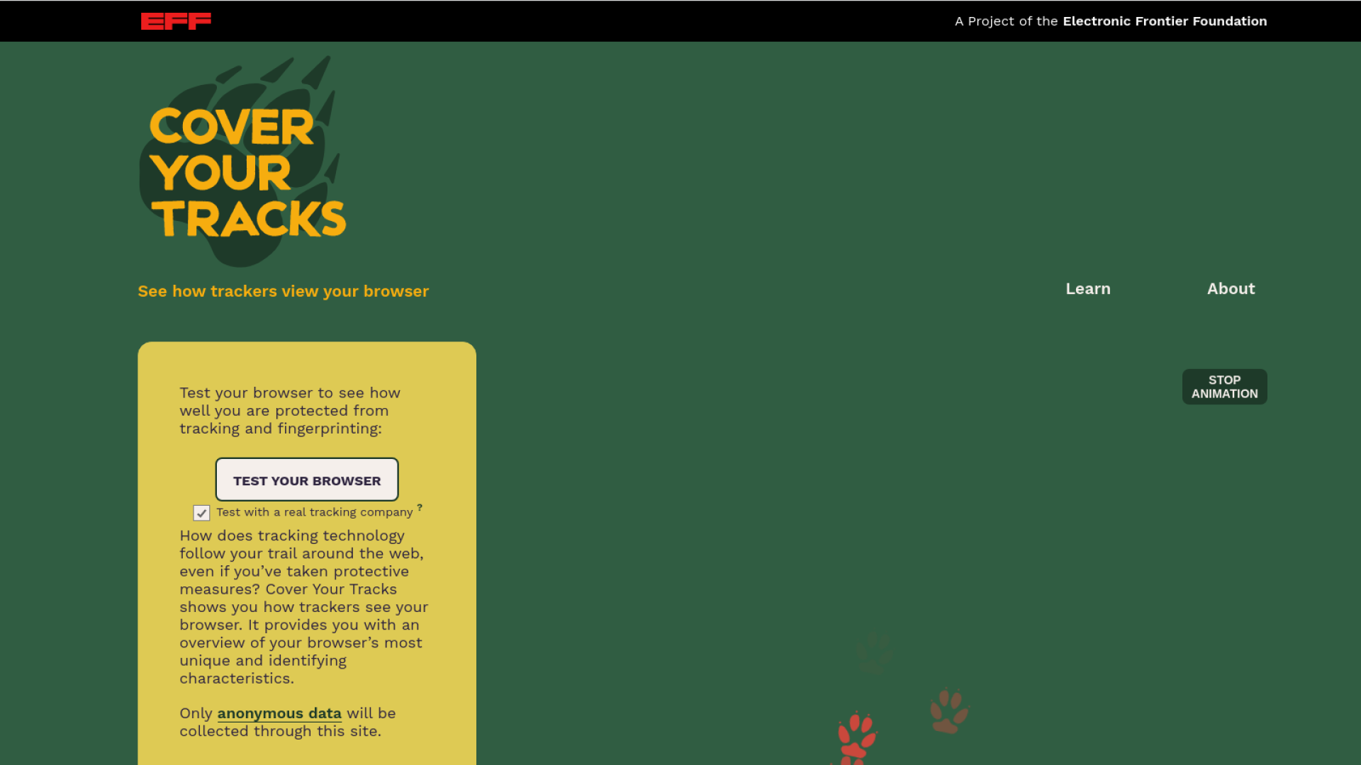 EFF নিরাপত্তার এসব বিষয়ের উপর নজর রাখে। EFF এর পূর্ণরূপ হলো Electronic Frontier Foundation। এটি মূলত এক ধরনের টুলস। পূর্বে এটা Panopticlick নামে পরিচিত ছিলো। বর্তমানে এটা অনেকটাই উন্নত ভার্সনের টুলস এবং এর নাম পরিবর্তিত করে রাখা হয়েছে CoverYourTracks।
