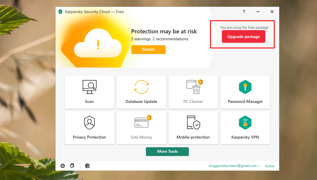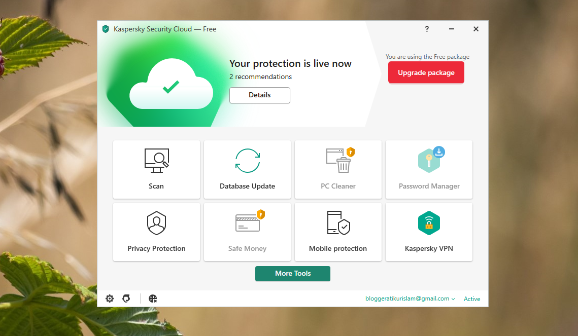 রেজিস্ট্রেশন করার পরে আপনার একাউন্টের অটোমেটিক লগইন হয়ে যাবে এবং ব্যবহারকারীদের সুরক্ষা প্রদানের লক্ষ্যে Kaspersky Security Cloud তখন থেকেই ব্যাকগ্রাউন্ডে একটিভ হয়ে যাবে। সাধারণত অন্যান্য ফ্রি প্রোডাক্টগুলোর মতোই এটি ব্যবহার করার ক্ষেত্রে ও আপনি প্রমোশনাল একটি মেসেজ দেখতে পাবেন; যেখানে আপনাকে বলা হবে যে, আপনি তাদের Upgrade plan করতে চান কিনা। যাইহোক, এখানে আপনাকে কিছু ফিচার ব্যবহার করার জন্য আপনাকে তাদের আপডেট প্যাকেজ কিনে নিতে হবে, আর এগুলো আপনি মার্ক অবস্থায় দেখতে পাবেন।