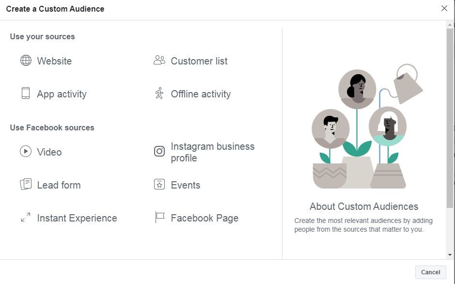 ফেসবুক এর বিভিন্ন টিউন, ভিডিও, ইভেন্টস, লিড ফর্ম, ইনস্ট্যান্ট এক্সপেরিয়ান্স এর সঙ্গে যারা এঙ্গেজ হয় তাদের ডাটা ব্যবহার করে এই কাস্টম অডিয়ান্স তৈরি করা যায়। এ ছাড়াও ইন্সটাগ্রাম বিজনেস প্রফাইল এর ডাটা ব্যবহার করা যেতে পারে। এই সব উৎস থেকে ৩৬৫ দিন মেয়াদি ডাটা ব্যবহার করা যেতে পারে। তবে লিড ফর্ম এর ক্ষেত্রে এর মেয়াদ ৯০ দিন।