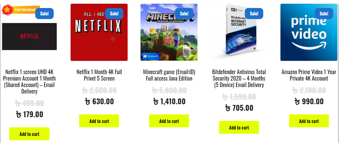 We are authorized and certified Seller. We deals online selling products. Official store in Bangladesh.Our approach is to provide you error free and Antivirus Certified products. We deals the Netflix (viewing), FIFA, Prime Videos, Apple Store (music), Spotify, Audible, Minecraft(games). We are mainly partners with: Kaspersky, Revte Antivirus, Malwarebytes, NordVPN, Microsoft Store (windows products), Daraz Bangladesh.
