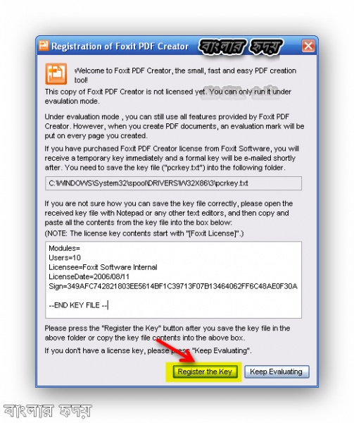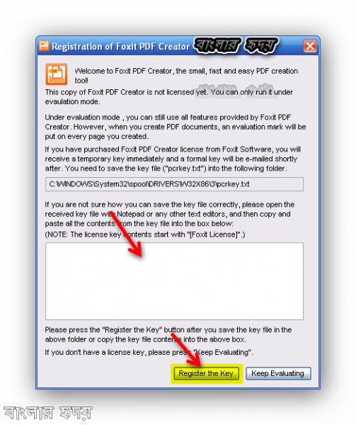 Finish তে ক্লিক করার পর এই উইন্ডোটি আসবে এবং যেখানে সাদা পারা ফাঁকা যাইগাটি আছে সেখানে Register Key টি Paste করতে হবে এবং Register the Key তে ক্লিক করতে হবে । এবং Foxit PDF Creator সফটওয়্যারটি Full Version হয়ে যাবে ।