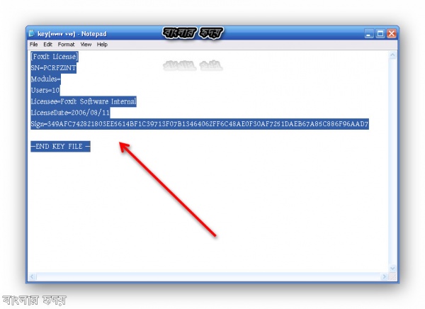 Foxit PDF Creator সফটওয়্যারটি Register করার জন্য ডাউনলোড করা ফাইলটির মধ্য Key যে ফাইলটি আছে সেই ফাইলটিকে Notepad দিয়ে ওপেন করালে নীচের পারা উইন্ডোটি আসবে এবং এখানে যা কিছু আছে Copy করতে হবে ।