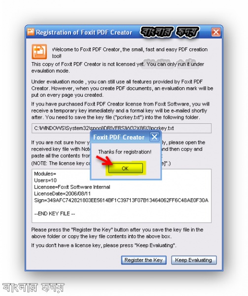 Register the Key তে ক্লিক করার পর এই উইন্ডোটি আসবে এবং OK তে ক্লিক করতে হবে । এবং Foxit PDF Creator সফটওয়্যারটি Full Version হয়ে যাবে ।