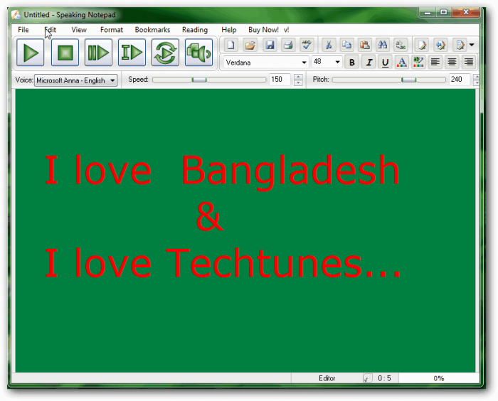 আপনি এই notepad এ ইংলিশে যা ইচ্ছে তাই লিখে উপরের play button এ click করুন ।ও আপনাকে আপনার setting অনুযায়ী word or sentence আকারে পড়ে শোনাবে ।আপনার ইচ্ছা অনুযায়ী speed,pitch কমিয়ে বাড়িয়ে শুনতে পারেন ।এমনকি আপনার কম্পিউটারে থাকা যেকোন বড় text or pdf ফাইল এই notepad এ open করে play বাটন চালু করলে ও আপনাকে পড়ে শোনাবে । এবং আপনি speech টি audio আকারে ও save করে রেখে যেকোন সময় enjoy করতে পারেন,তবে আপনি যখন আপনার কম্পিউটারের text or pdf file open করতে যাবেন তখন আপনাকে 2টা plugin setup দেওয়ার কথা বলবে ।plugin ২টি setup দিয়ে নিবেন সামান্য সময়ের মধ্যে plugin ২টি setup হয়ে যাবে ।এই notepadটিতে ms word এর অনেকগুলো tool এমনকি bookmark করার ব্যবস্থা আছে ।