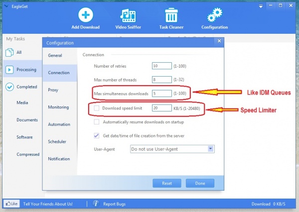Configuration এর সকল অপশন সমূহ IDM এর মতই শক্তিশালী। একটু ঘাটাঘাটি করলেই সব বুঝতে পারবেন। যেমনঃ Connection সাবমেনুতে Max Simultanous Download দিয়ে এক সাথে কয়টি ফাইল ডাউনলোড করবেব তা নির্দারন করতে দিতে পারবেন যা IDM এর Queues এর কাজ করে। এছাড়া রয়েছে Speed Limiter যা ব্যবহার করে ডাউনলোড লিমিট বাড়িয়ে-কমিয়ে দিয়ে ডাউনলোড করার পাশাপাশি ব্রাউজিংও করতে পারবেন।