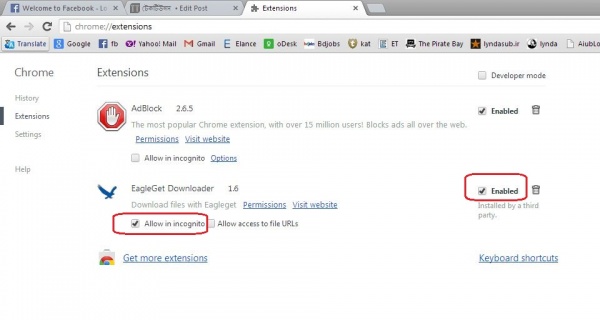 ইনস্টল করা হলে Mozilla Firefox এবং Google Chrome এ add-ons গুলো যুক্ত করতে ভুলবেন না। Firefox চালু করার সাথে সাথে add-ons এর নটিফিকেশন পাবেন। আর Chrome এ Settings >Extension এ গেলে EagleGet এর add-ons টি দেখতে পাবেন। সেখান থেকে নিচের ছবির মত করে Enabled এবং Allow in incognito টিক চিহ্নিত করে দিন।
