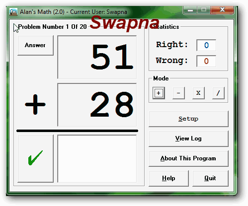 ২য় সফটওয়্যারটির নাম Alans_Math_by_HP । এটি সাইজে খুবই ছোট মাত্র 140kb ।কিন্তু দারুন কাজ করে ।এই softwareটির মাধ্যমে বাচ্চারা add, subtract, multiplication, division এর নিজেরাই নিজেদের test নিতে পারবে । softwareটি open করলে অনেকগুলো ফাইল পাবেন আপনি amath20 ফাইলটিতে ক্লিক করেই open করুন আর math provlem solve করতে দিন বাচ্চাদেরকে ।