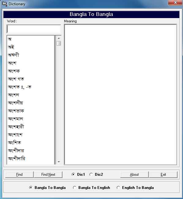 কোন শব্দের অর্থ জানা না থাকলে সেক্ষেত্রে মুহূর্তেই সেই শব্দের অর্থ খুঁজে বের করতে ডিকশনারির জুড়ি নেই। যারা লেখাপড়া করেন বা যাদের নিত্য নতুন শব্দের অর্থ শেখার শখ তাদের কাছে ডিকশনারি অতি গুরুত্বপূর্ণ একটি মাধ্যম। ডিকশনারি দুই প্রকার হতে পারে। কাগজে মুদ্রিত আর প্রোগ্রামে লিখিত। বর্তমানে কম্পিউটার বা অন্য কোন আধুনিক ডিভাইজে ব্যবহার উপযোগী ডিকশনারি বহুল জনপ্রিয়। আজ আপনাদের সাথে আমার কাছে থাকা বাংলা থেকে বাংলা/ইংরেজি এবং ইংরেজি থেকে বাংলা অনুবাদ করার একটি ডিকশনারি শেয়ার করবো। যারা প্রয়োজন মনে করেন তারা নিচের লিংক থেকে ডাউনলোড করে নিন।