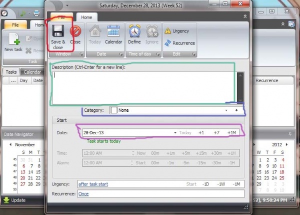 এবার আপনি description এর ঘরে আপনার ডেসক্রিফশন লিখুন। যেমন লিখলেন শুভ জন্মদিন। category তে আপনার ডেসক্রিফশনটি যে বিষয়ে সে কেটাগরি সিলেক্ট করে দিন। তারপর date এর ঘরে ডেট টাইম ঠিক করে দিন মানে যে দিন আপনাকে মনে করিয়ে দেওয়া দরকার সে তারিখটি দিন এবং সর্বশেষ save & close এ ক্লিক করে বেরিয়ে আসুন। ব্যাস এবার আপনার সিলেক্ট করে দেওয়া সময, তারিখে অটোমেটিক ওটা আপনাকে মনে করিয়ে দিবে।