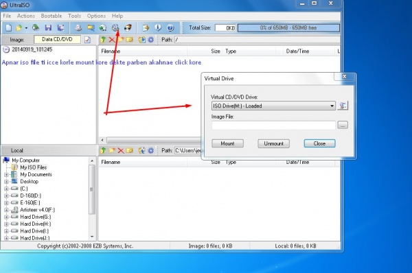 Virtual cd/dvd এর নিচে ইমেজ ফাইল থেকে আপনার আই এস ও ফাইল টি ক্লিক করে বের করুন আর mount button এ ক্লিক করুন। তারপর সিডি ড্রাইভ বা যে কোন ড্রাইভ এর নিচে দেখবেন আপনার আই এস ও ফাইল টি শো করছে ।