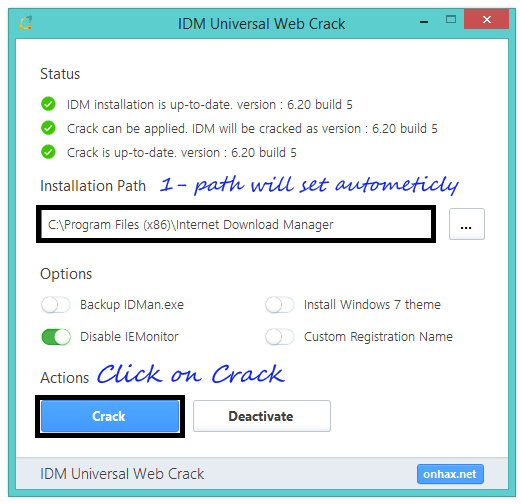 ৩. Crack Button এ ক্লিক করুন। IDM activated successfully আসা পর্যন্ত অপেক্ষা করুন।