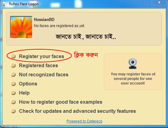 Google মামাকে কাজে লাগিয়ে ১টী সফট পেলাম, এই সফটটির কাজ হল আপনার ছবি/মুখের হাসি দিয়ে লগইন করতে পারবেন আপনার পিসি, আমার কাছে ভাল লেগেছে আশা করি আপনার কাছেও ভাল লাগবে। এতে কিছুটা নিরাপত্তা থাকবে আপনার পিসি অন্যের হাত থেকে।