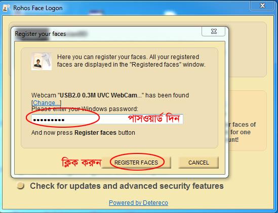 তাহলে নিচের মত আসবে, এখন Please enter your windows password ঘরে পাসোয়ার্ড টাইপ করে Register Faces বাটনে ক্লিক করে আপনার হাসি মাখা মুখ/ফেস টি দেখিয়ে দিন।