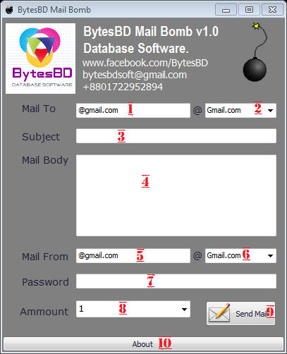 আজ আপনাদের জন্য নিয়ে এলাম BytesBD Mail Bomb v1.0 যার সাহায্যে আপনি হাজার হাজার মেইল করতে পারবেন এক ক্লিক এই।