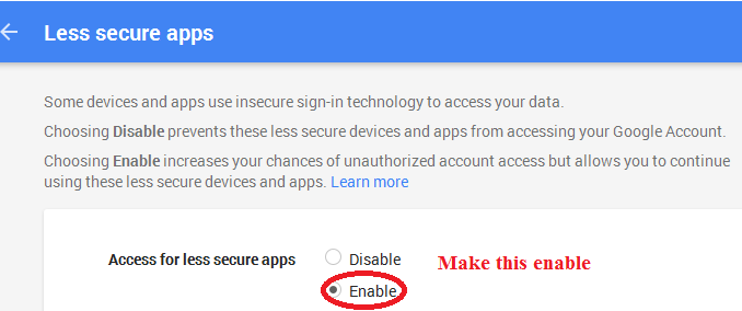 https://www.google.com/settings/security/lesssecureapps?pli=1 থেকে নিচের মত Access for less secure apps টা Enable করুন।