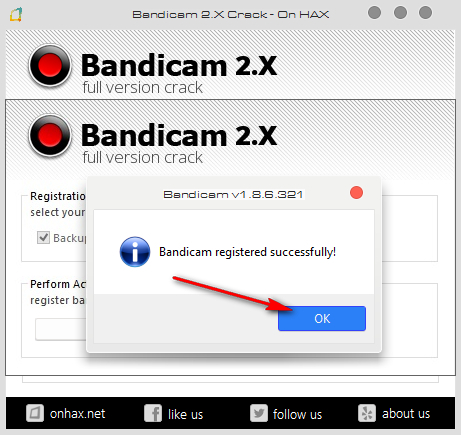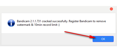 Bandicam register successfully দেখালে ফুল ভার্সন হয়ে যাবে, ওকে তে ক্লিক করে দিন এবং Crack টি ক্লোজ করে দিন ।