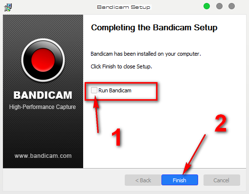 ইন্সটল প্রক্রিয়া অন্য সব সফটওয়ারের মতই প্রথমে "bdcamsetup2.1.1.exe" ফাইল এ ডাবল ক্লিক করেন এবং স্ক্রীন এ দেখান প্রসেস ফলো করুন, Finish এ ক্লিক করার আগে "Run Bandicam" বক্সটি আনচেক করে দিন, নিচের স্ক্রীন শর্ট টি দেখুন ।