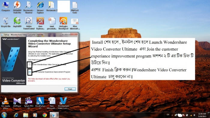 ধাপ:২। Install শেষ হলে , ইনস্টল শেষ হলে Launch Wondershare Video Converter Ultimate এবং Join the customer experiance improvement program অপশন ২ টি এর টিক চিহ্ন টি উঠিয়ে দিন । এরপর Finish ক্লিক করুন ।Wondershare Video Converter Ultimate চালু করবেন না ।
