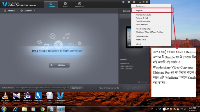 ধাপ:৪। এরপর একটু খেয়াল করুন যে Register অপশন টি Disable হয় নি । ভয়ের কিছু নাই আপনি এই ভার্সন এ Wondershare Video Converter Ultimate Pro এর সব ফিচার পাবেন । কারণ এটি "Medicine" ফাইল Crack করা ভার্সন ।