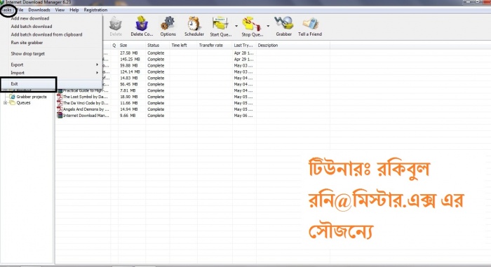 ধাপ:৪. Install শেষে এখানে Internet Download Manager এর Tasks মেনু থেকে Exit করান।
