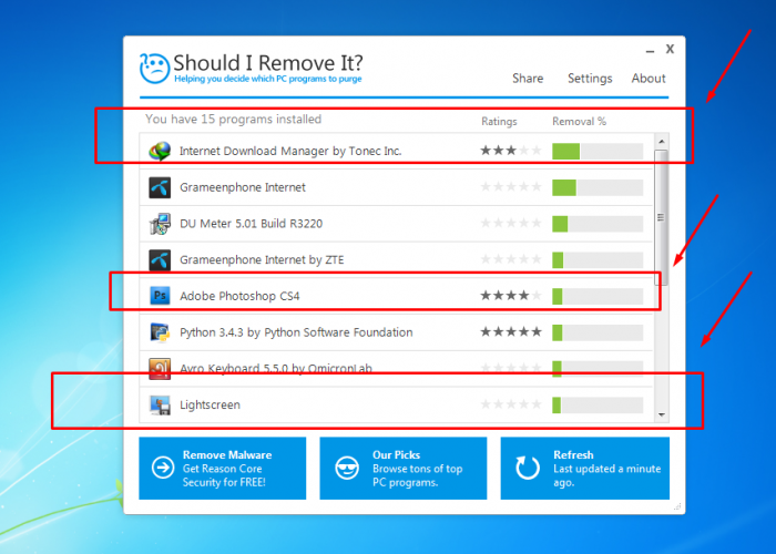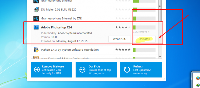 সফটওয়ার গুলার পাশে রেটিং দেখাবে। অপ্রয়োজনীয় সফটওয়্যারগুলো লাল রেটিং (RED RATING ) এ দেখাবে। অর্থাৎ এই সফটওয়্যারগুলো অপ্রয়োজনীয় এবং ক্ষতিকারক। এবং যেগুলা সফটওয়ার ক্ষতিকারক সেই গুলা রেটীং অনুযায়ী আনস্টল করবেন।