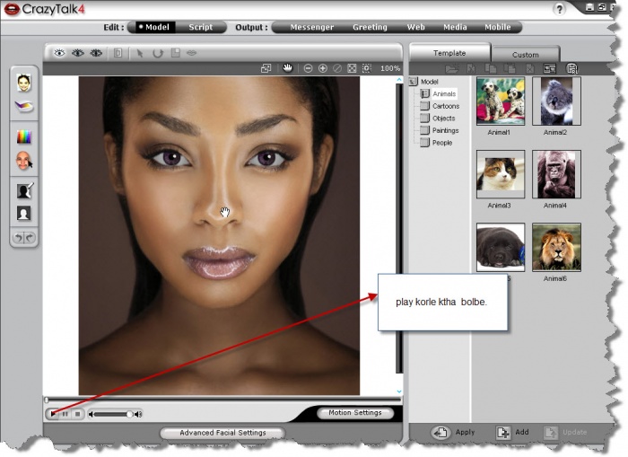 Record হওয়ার পর OK তে ক্লিক করুন। তারপর play করুন দেখুন আপনার কথা টা বলছে মুখ নাড়িয়ে নাড়িয়ে। দারুন মজা তাই না? এই টা কে চাইলে আপনি Messenger, Greeting, Web, Media, Mobile এ সেভ করতে পারবেন।