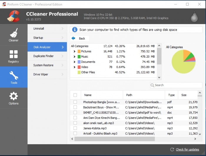 ডিস্ক এনালাইজারঃ CCleaner professional এর সর্বশেষ ভার্সনে যুক্ত হওয়া দারুণ একটি সুবিধা এই ডিস্ক এনালাইজার। এর মাধ্যমে শুধু এক ক্লিকেই ড্রাইভে কি কি আছে ও কি পরিমানে আছে তা দেখা সম্ভব। যার কারনে খুব সহজেই আমরা প্রয়োজন মত ফাইল সরিয়ে ড্রাইভের জায়গা সঠিক ব্যবহার করতে পারবো।
