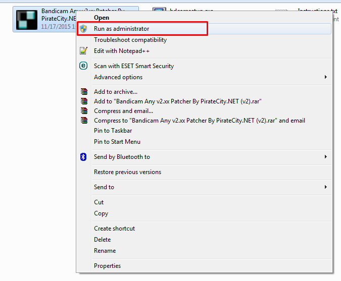 এবার আপনাকে ডাউনলোড করা সফটওয়্যার এর ফোল্ডার এ যেতে হবে এবং Bandicam Any v2.xx Patcher By লেখা ফাইল তি রআন এস আডমিনিসটর ক্লিক করে রুন করা তে হবে।নিছের ছবি দাখুন