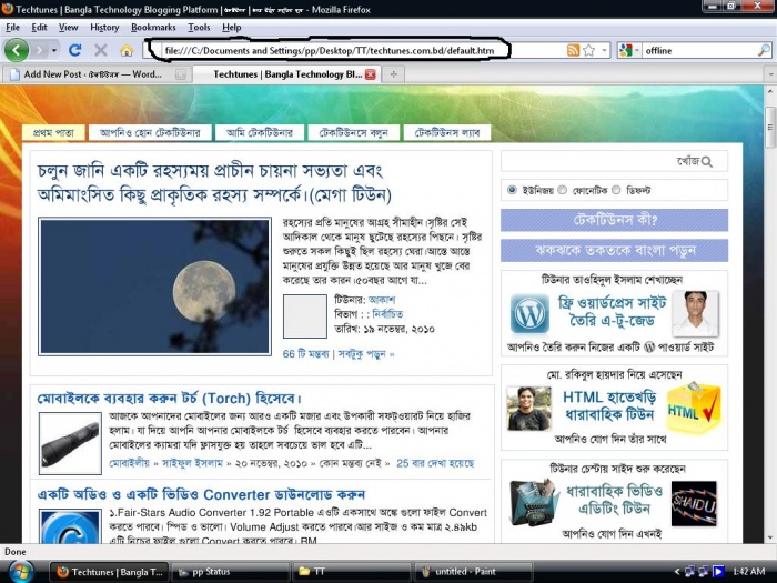 ৬। টিং টিং টি টিং, এবার রেডি হয়ে যান ইন্টারনেট ছারা টেকটিউনস পড়তে প্রথমে টেস্ট করার জন্য আপনার নেটের নাইল ডিসকানেক্ট করুন। এখন যেখানে Export করেছিলেন সেই ফোল্ডারে যান গিয়ে দেখুন অনেক ফাইল আছে সেখান থেকে contents.htm নামের ফাইল টি মজিলা দিয়ে ওপেন করুন (এক্সপ্লরার দিয়ে কেনো জানি আপাতত আমি পারতেছি না।)
