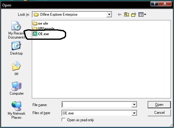 ৩। পেচ ফাইলে ক্লিক করুন তারপর পেচ লিখাটায় ক্লিক করুন তারপর এখানে যান c/program files/Offline Explorer Enterprise/ এখন OE.exe টা সিলেক্ট করে ওপেন করুন নিচের ছবির মত।