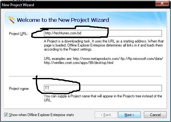 ৪। এখন ডেস্কটপ থেকে Offline Explorer Enterprise ওপেন করুন project URL এর ঘরে লিখুনhttps://www.techtunes.io আর project নেম এর ঘরে লিখুন tt নিচের ছবির মত তারপর নেক্সট দিন।