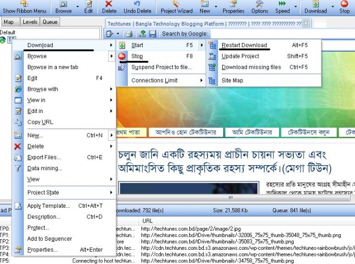 ৫। যদি মনে করেন যতটুক চেয়েছেন ততটুক ডাউনলোড হয়ে গেছে তাহলে নিচের ছবির মত নির্দিষ্ট Project (TT)-এ রাইট ক্লীক করে → Download → Stop এ ক্লীক করুন। আপনি চাইলে আবার একই জায়গা থেকে ReStart Download দিয়ে ডাউনলোর শুরু করতে পারবেন। আবার যদি চান আপডেট করতে তাহলে আপডেট ও করে নিতে পারবেন। নিচের ছবিটি দেখুন।