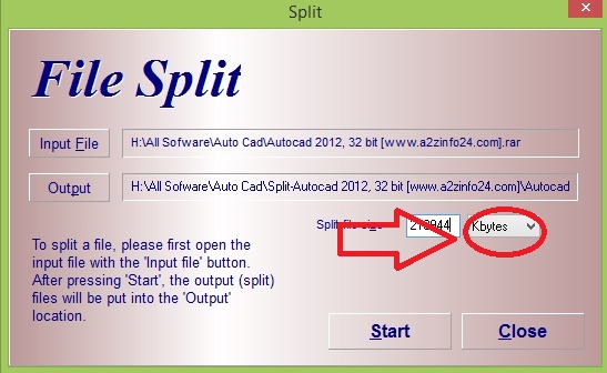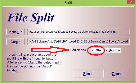৬. এবার ফাইলটিকে কয়টি ভাগে ভাগ করতে চান সে জন্য আপনাকে একটু ক্যালকুলেশন করতে হবে। যেমন : ১ জিবি = ১0২৪ এমবি। এবার ১0২৪ এমবিকে ৫ দিয়ে ভাগ করুন। কতে আসে?২0৪.৮ এমবি। তাইতো? তাহলে আপনার Splite File Size ২0৪.৮ এমবি লিখে দিন।