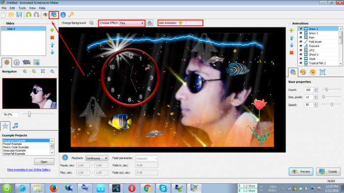 এবার নীচের ছবিটি দেখুন। আপনি আপনার ছবি দিয়ে স্ক্রীনসেভার বানাতে চাইলে Change Background এ ক্লিক করে আপনার ছবি অ্যাড করে নিন। তারপর Chose effect এ ক্লিক করে কিছু এফেক্ট যোগ করে নিন এবার Add animation ডুকে আপনার ইচ্ছেমত অ্যানিমেসন যোগ করে বানিয়ে ফেলুন আপনার পছন্দের স্ক্রীনসাভার। স্কিনসাভারটি আপনি সেভ করতে চাইলে তির চিনহিত স্থানে ক্লিক করুন তারপর যেকোনো নামে সেভ করুন। আমি এখানে কিছু অ্যানিমেসন আপনাদের বোঝার সুভিধার জন্য ব্যবহার করেছি। এছাড়াও অনেক অ্যানিমেসন আছে যেগুলো আপনি ব্যবহার করলেই পেয়ে যাবেন।