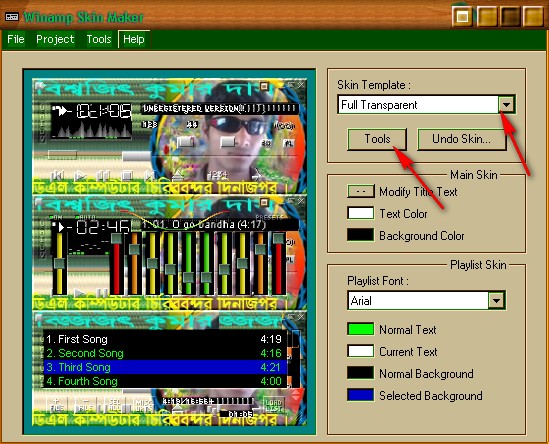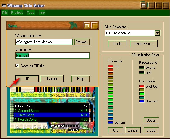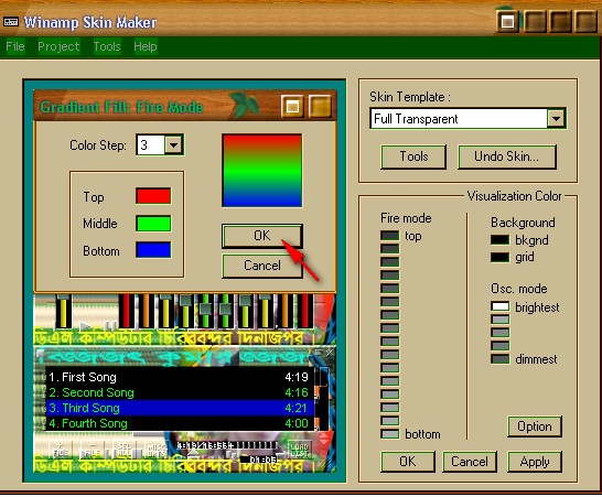 এখানে Skin template কি রকম প্লেয়ার এর স্কীন নেবেন সে হিসাবে সিলেক্ট করুন আমি সিলক্ট করছি Full Tranest parent আপনারা যে টা দিবেন সেটা সিলেক্ট করুন তার পর Tools ক্লিক করলে ২ দুটি অপশন আসবে সেখানে Visulaiztion color Editor ক্লিক করুন নিচে Option লেখা আসবে সেখানে ক্লিক করলে Gradient fill fire mode ক্লিক করলে নিচে ফলো করুন