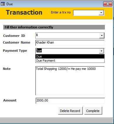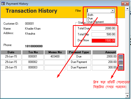 ৬. কাস্টমারে আইডি দিয়ে এক নজবে দেখে নিতে পারবেন, কাস্টমার কোন তারিখে তোন মেমো নাম্বারের আওতায় কত টাকা বাকী করেছিল, কোন কোন তারিখে কত টাকা করে টাকা পরিশোধ করেছিল এবং তার বর্তমান কত টাকা বাকী রয়েছে। কাস্টমার চাইলে তার লেনদেনের হিসাবটি পিন্ট দিতে পারবেন।