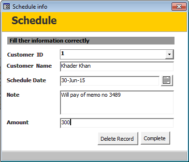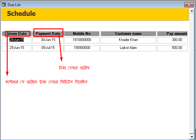 ৫. অনেক সময় কাস্টমাররা আপনাকে নির্দিষ্ট কোন তারিখে টাকা পরিশোধের কথা দিতে পারে, সেই ক্ষেত্রে আপনি তা সিডিউল করে রাখতে পারবেন। বর্তমান তারিখ দিয়ে সার্চ করলে কোন কোন কাস্টমারআপনাকে আজকের তারিখে টাকা দেয়ার কথা ছিল তার লিস্ট পাওয়া যাবে। কিংবাআপনি নিদিষ্ট তারিখ কিংবা তারিখ এর মধ্যে সিডিউল দেখতে পারবেন। প্রয়োজনে তাদের কে ফোন দিতে,টাকা পেতে সহয়তা করবে।