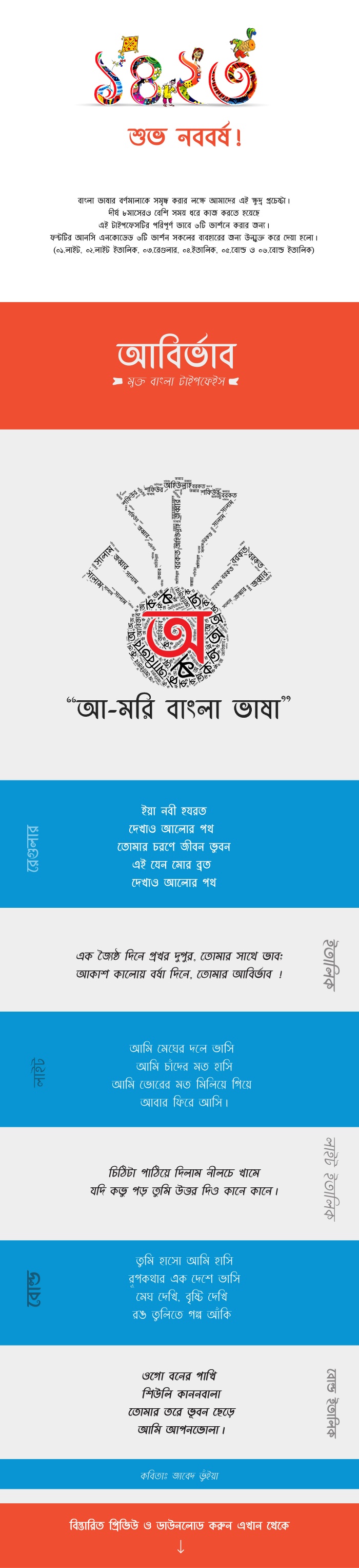 আমার পরিচিত এক ছোট ভাই কিছুদিন আগে বেশ সুন্দর একটি বাংলা ফন্ট ডিজাইন করে। বেশ অল্প দিনেই ফন্টটি অনেক জনপ্রিয় হয়ে উঠে। যেহেতু আমাদের বাংলা ফন্টের সংখ্যা খুবই কম তাই এই ধরণের বাংলা ফন্ট তৈরি আমাদের জন্য খুবই আনন্দের বিষয়। তাই আবির্ভার ফন্ট নিয়ে বিস্তারিত শেয়ার করলাম। নিচের অংশটি আবির্ভাবের অফিসিয়াল লিঙ্ক থেকে নেয়া।