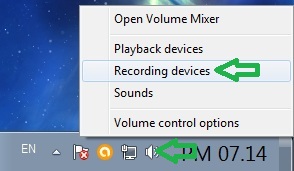 ১। "Speakers" এর উপরে ডান বাটনে ক্লিক করে "Recording devices" এ ক্লিক করেন।