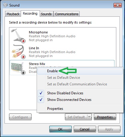 ৪। "Stereo Mix" এর উপরে ডান বাটনে ক্লিক করে "Enable" এ ক্লিক করেন।