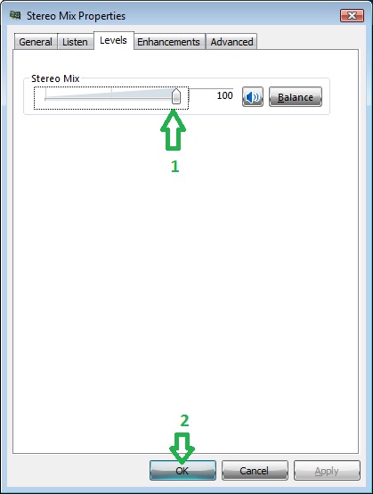 ৬। "Stereo Mix Properties" থেকে "Levels" এ ক্লিক করে "Stereo Mix" "100" দিয়ে "Ok" করেন।