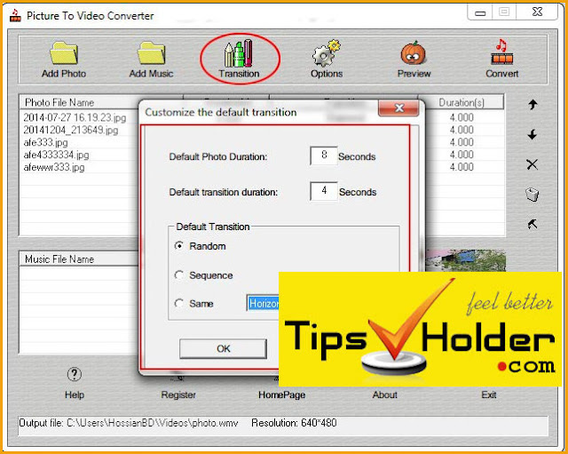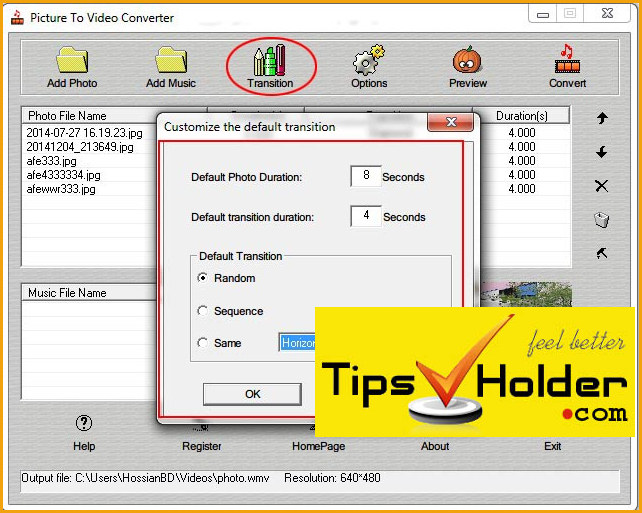 এবার Add Photo বাটনে ক্লিক করে আপনার ছবি দেখিয়ে দিন। তারপর Transition বাটনে ক্লিক করে ছবির ইফেক্ট সিলেক্ট করুন।