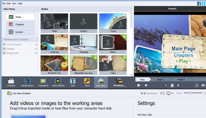 Storyboard offers a good option for beginners to get started with something simple, whereas timeline offers more sophisticated features and unlimited tracks. Once you’ve finished with your project, the simple disc authoring feature provides you the option to add animated menus with the use of templates, or you can create your own.